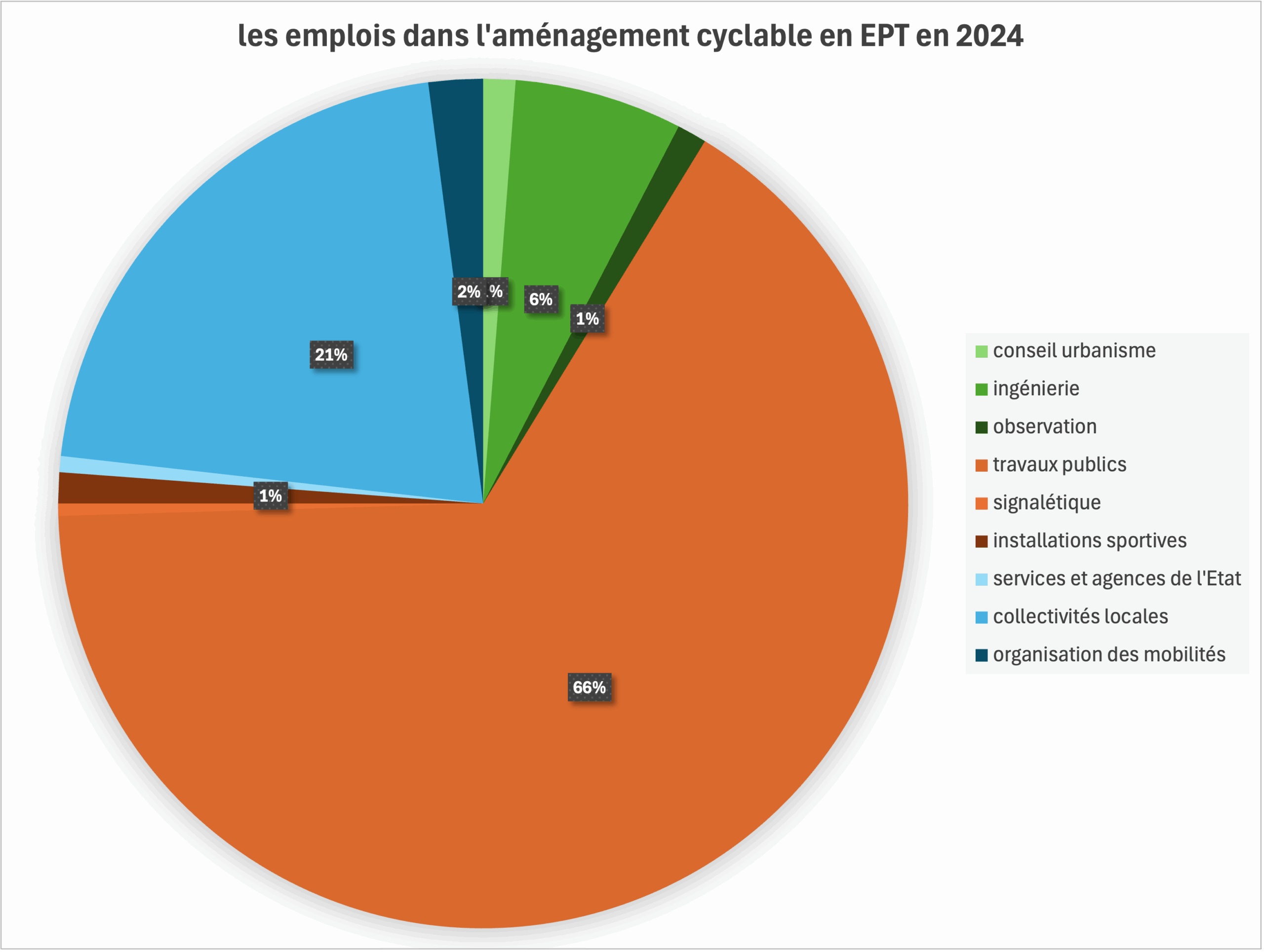 - Le secteur en charge de la réalisation des aménagements cyclables 7175 ETP soit 67% : à côté du secteur des travaux publics et routiers, il y a également la question de l’aménagement des installations sportives et de loisirs et la signalétique et le jalonnement. Nous avons travaillé avec la FNTP, Routes de France et le Réseau Vélo Marche pour préciser le nombre d’emplois en équivalents temps pleins de ce secteur (cf infra).
