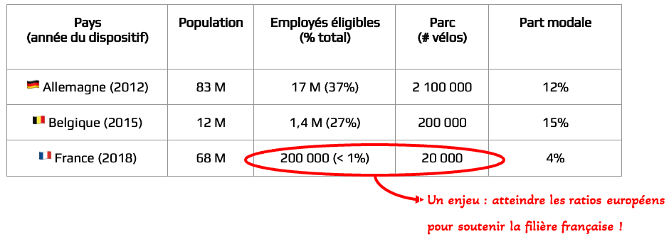 Aujourd’hui 60 % des déplacements domicile-travail de moins de 5 km sont réalisés en voiture selon l’INSEE en 2021 et 70 % des Français vont en voiture au travail. Or c’est la distance idéale à réaliser à vélo au quotidien d’autant que l’avènement du vélo à assistance électrique rend possible de nombreux trajets de manière efficace et confortable, mais avec un coût élevé d’investissement difficilement supportable par le seul salarié. Le prix moyen d’un VAE est aujourd’hui de 2000 euros alors que le salaire moyen est de 2200 euros en 2024. Les employeurs peuvent jouer un rôle majeur afin de promouvoir les mobilités actives. Développer une offre vélo est aussi un outil des employeurs pour respecter et renforcer leurs engagements RSE et réduire leur bilan carbone. C’est une des solutions poussées également par tous les acteurs du vélo à l’échelle européenne.